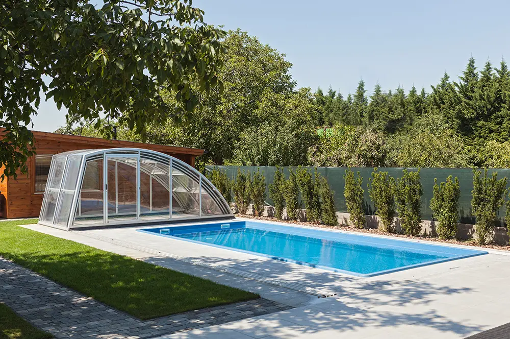 Mit seiner begehbaren Höhe ermöglicht Ihnen unser Modell PRACTIC PLUS Ihr Schwimmbecken als echte Wellnessoase wetterunabhängig zu nutzen. Die asymmetrisch erhöhte, leicht schräge Seitenwand ist besonders bemerkenswert an diesem Modell.