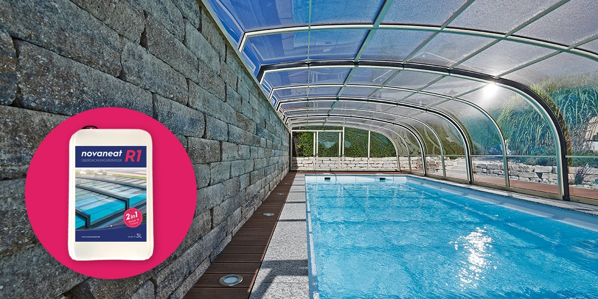 Ob nach dem Frühjahrsstart, während der Sommersaison oder vor dem Wintereinlagern – der NOVANEAT Reiniger R1 ist zu jeder Zeit die richtige Wahl. Durch die spezielle Formulierung entfernt er zuverlässig Pollen, Blätter, Kalk- und Wasserflecken, die sich im Laufe der Monate auf der Überdachung ablagern. So bleibt Ihre Poolüberdachung nicht nur hygienisch sauber, sondern behält auch langfristig ihre brillante Optik und Funktionalität.